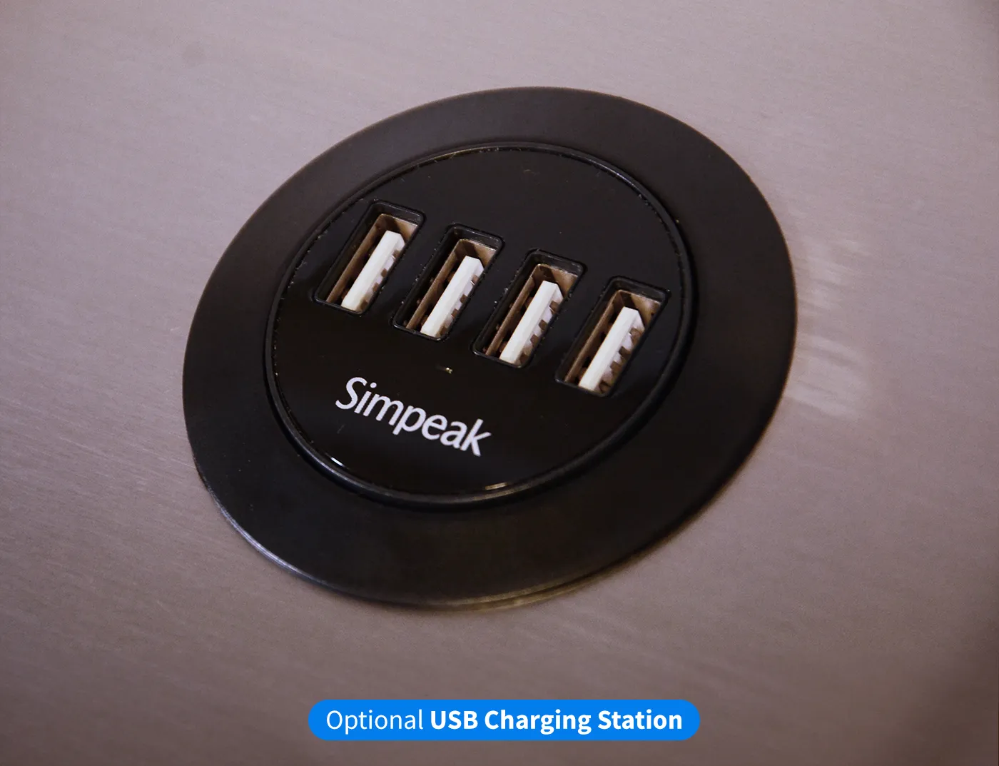 The flagship of our line is the Portable Professional Security Desk. Its stainless steel accents and curved design (the front panel is convex) give it a modern and professional look that’s great for airports, malls, hospitals, business centers or any other upscale location. The portable professional security desk features a stainless steel greeting counter that has the ability to integrate a USB charging station with 4 ports and a slot to accommodate the wiring for PC monitors, iPads, 2-way headsets and other electronics. There is a vented cage inside the security desk for one PC tower, a shelf and plenty of room for storage. The unit comes with a fold-down drawer with interchangeable positions to accommodate a keyboard . Sitting at 51″ in height this desk is perfect for greeting people from a sitting or standing position. This security station comes equipped with heavy-duty locking casters and the kick plate conceals the casters from view.